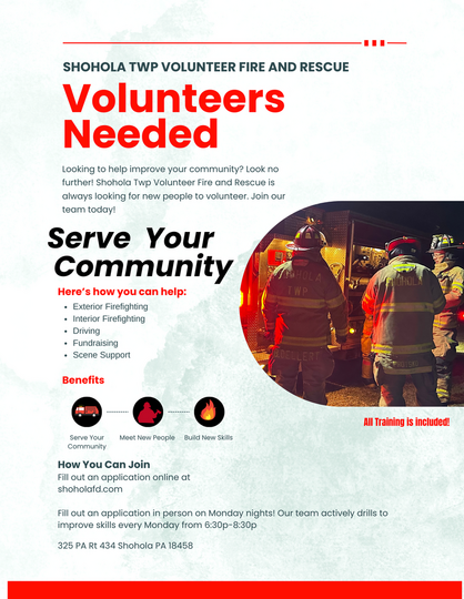 Shohola Township Volunteer Fire and Rescue (STVFR) has served the Shohola community protecting life and property since 1922. The department, entirely volunteer based and dispatched only by Pike county 911 center, operates to provide highly trained volunteer fire and rescue personnel throughout Pike County, Pennsylvania and beyond, 24 hours a day, 7 days a week, 365 days a year.